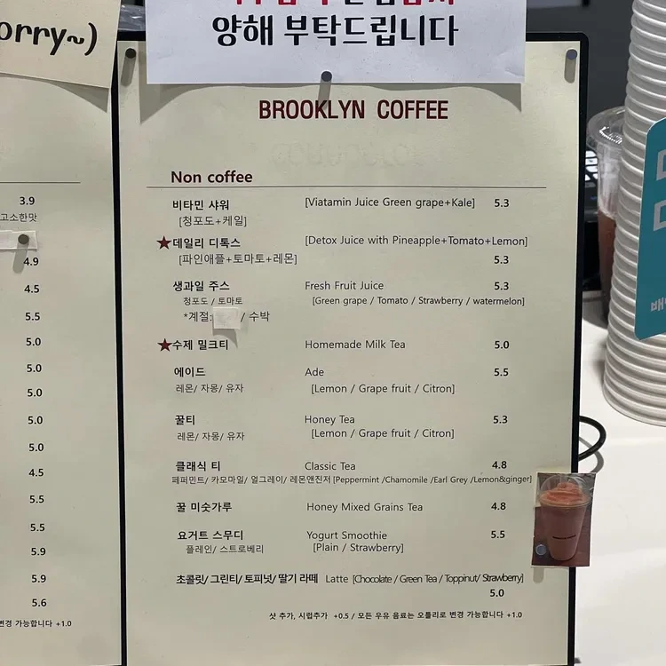Brooklyn Coffee는 다양한 비커피 음료도 제공하는 곳입니다. 이곳의 메뉴에는 비타민 주스와 허브차가 포함되어 있으며, 가격은 4,800원에서 5,500원 사이입니다.