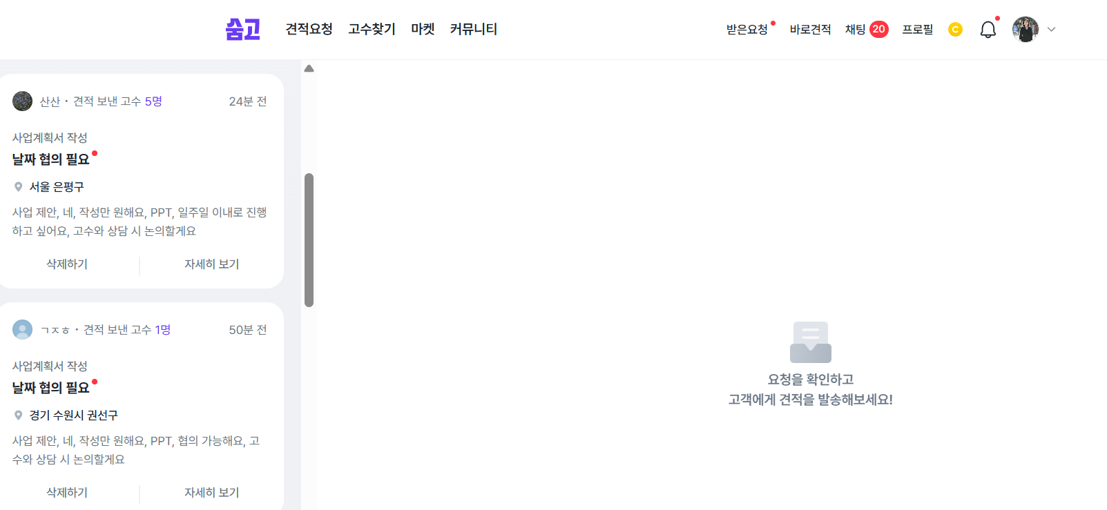 반면 숨고에서는 견적서를 보낸 지 3일 만에 첫 고객과 연결됐고, 그 뒤로도 꾸준히 요청이 들어왔습니다.