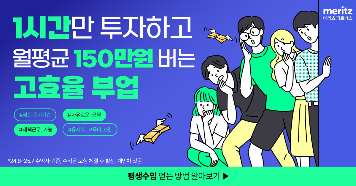 ** 수익 창출 프로세스 요약 ** 메리츠 파트너스 홈페이지 내 상담 신청 → 상담원 해피콜 후, 1:1 전담 멘토 배정 → 영상 시청, 모의고사 풀이 등 시험 준비 → 오프라인 시험 응시 → 메리츠 파트너스 활동 시작 → ** 수익 발생 ** 주요 소구점 1. 시간과 장소 등 시공간의 제약 없이 수익을 얻을 수 있는 N잡 2. 초기 자본금 0원! 단, 1원도 안 쓰고 부수입 벌 수 있어요 (자격증 취득 과정에서 소요되는 모든 비용(교육비, 시험 접수비 등)은 메리츠 파트너스에서 부담합니다) 3. 내 보험, 가족, 지인 보험을 직접 점검하여 보험료도 절감하고 수입까지 얻을 수 있어요 (수익은 보험 체결 후 발생하며 개인 차가 있을 수 있습니다.)